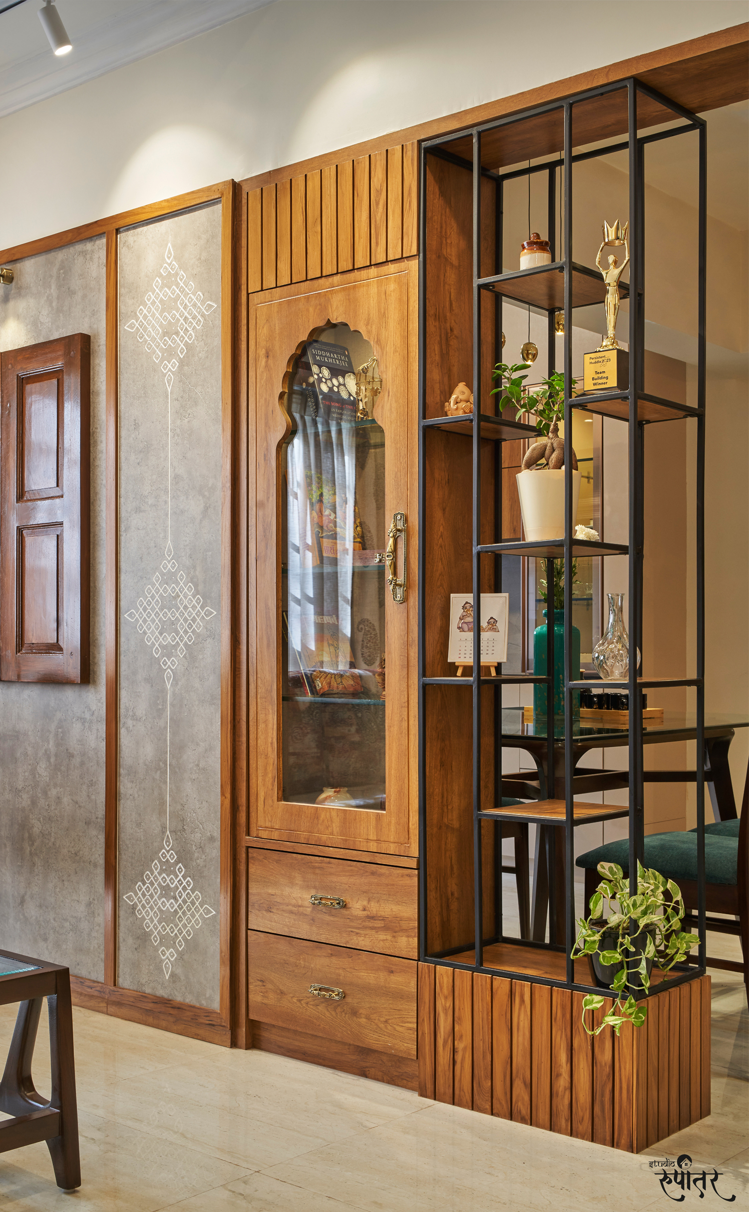 Talking Of The Design , Client Shared Their Love For Maharashtrian Elements Representing Their Roots … A Space Where Every Corner Reflects Their Background In A Subtle Way. The Openings In Living Area Offered New Opportunities To Be Explored In Terms Of Smooth Transition Between Living , Dining And Puja Corner.
