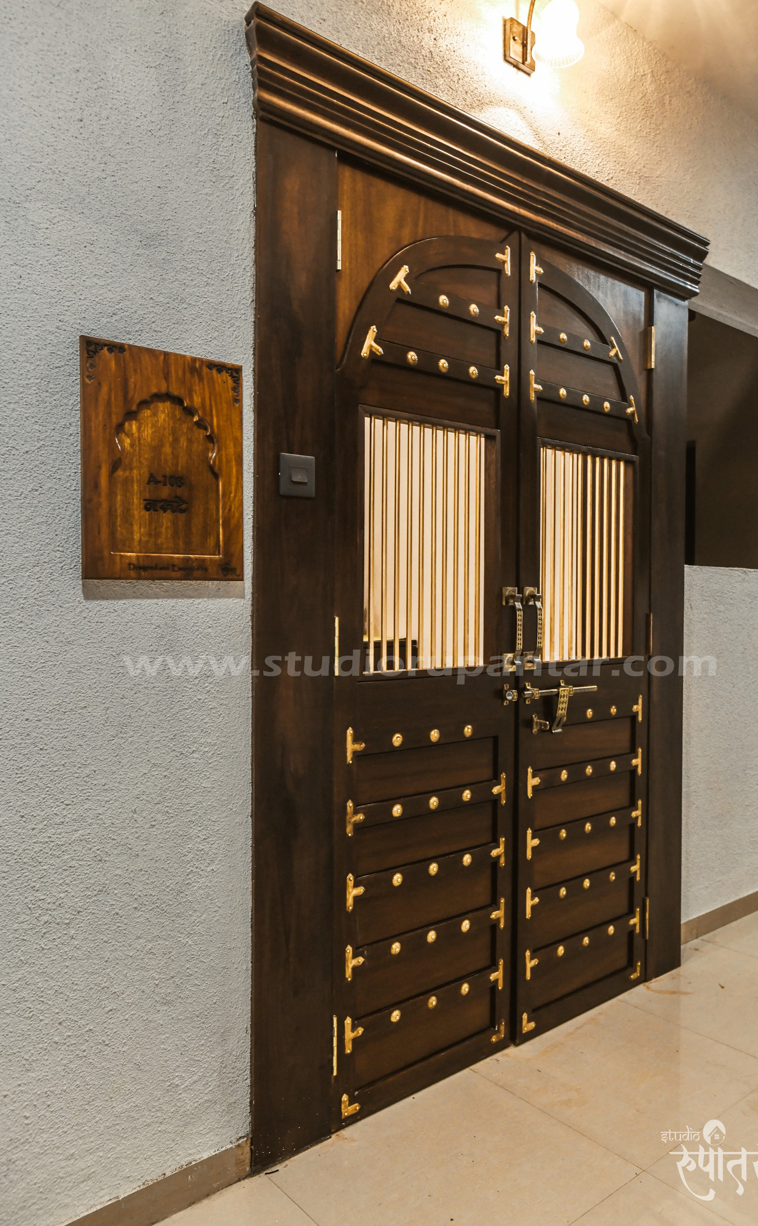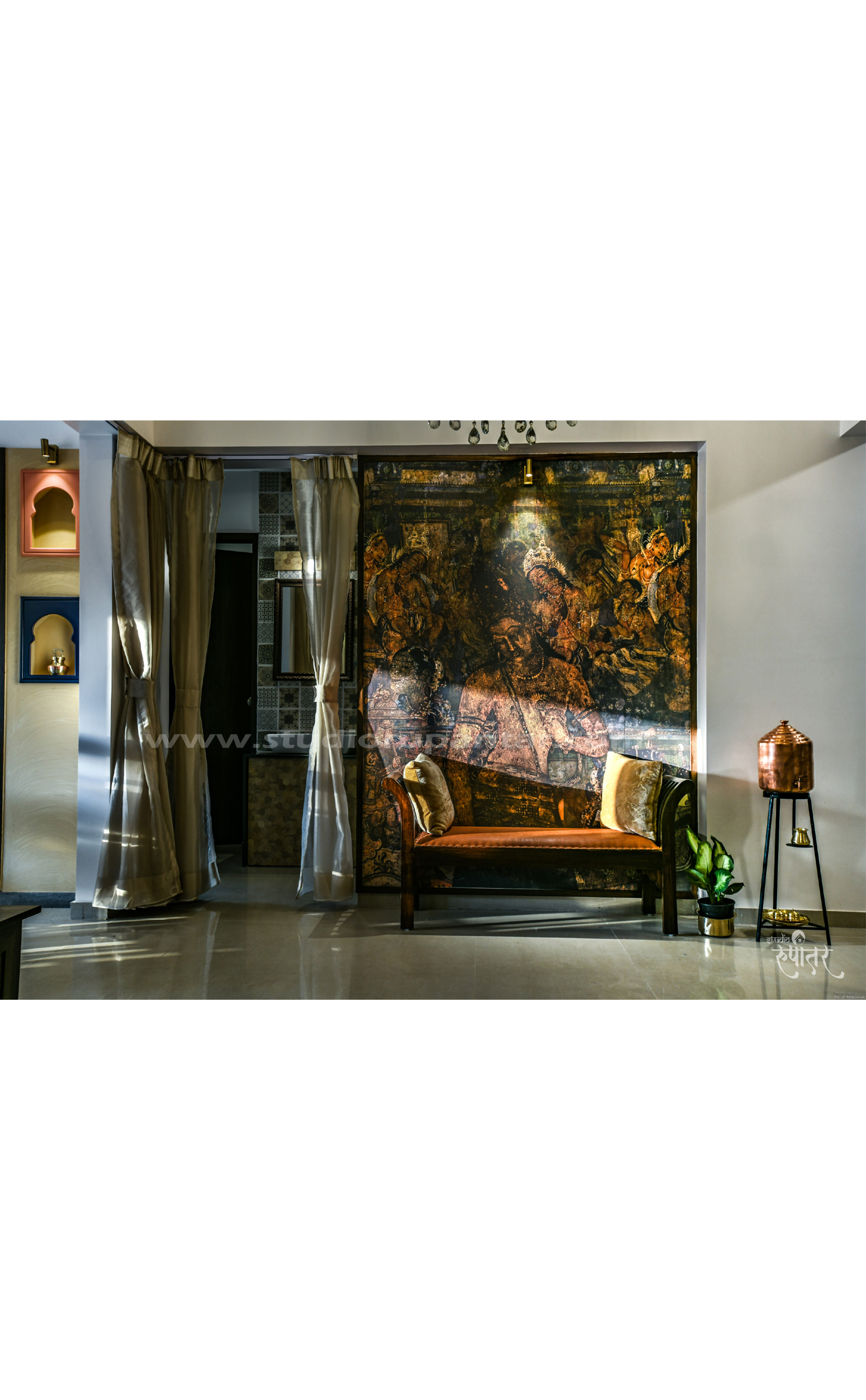The Home Illustrates Its Dynamic Impact At The Entrance Safety Door Which Was Designed From The Inspirational ‘Shaniwar Wada’. The Characteristic Elements Such As Golden ‘Gaj’, Top Cornice Molding, Typical Marastrian Arch Shape With Brass Elements Sways Its First Impression While Entering The Space.